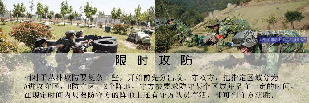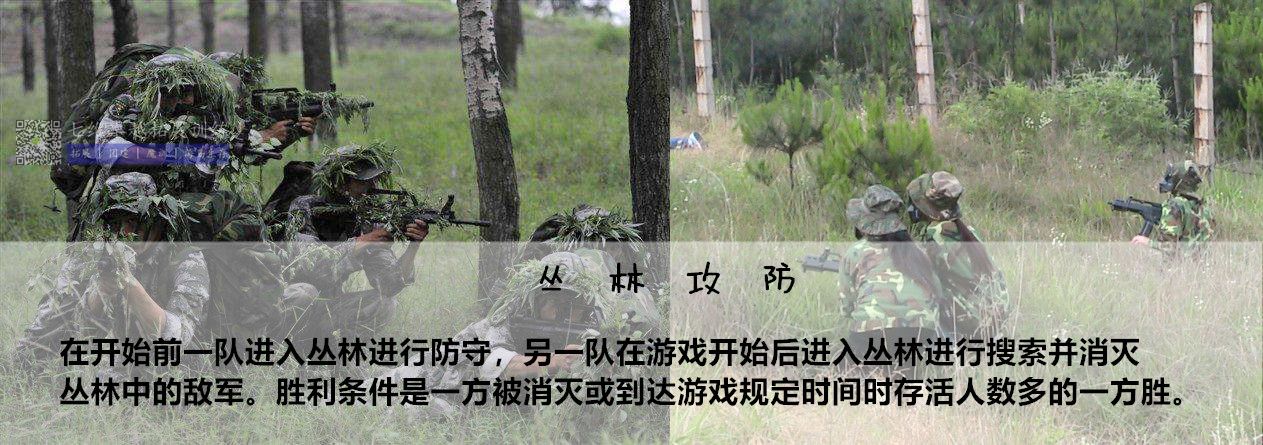 內容:相對於叢林攻防要複雜一些(xiē),開始前先分出攻、守雙(shuāng)方,把指定區域分為A進攻守區,B防守區,陣(zhèn)地由攻守雙方就地(dì)取材自行DIY構築,攻守方的陣地構築時間為20分鍾,防守方的陣地構築時間為30分鍾,守方被要求防守(shǒu)某個區域並堅守一定的時間,在規(guī)定時間內隻要防守方(fāng)的陣地上(shàng)還有(yǒu)守方隊員存活,即可判守方獲勝。而進攻方將配備一名醫療兵(bīng)(就是手持紅外遙控器佩戴紅十字標誌(zhì)的VIP,他的設置可使用無線手持遙控器完成)醫療兵是任務是(shì)救助(zhù)已方的士兵,為(wéi)其補充(chōng)生命使其能重(chóng)返戰場,而且次數不(bú)限,但醫療兵一(yī)旦陣亡就將判(pàn)進攻方失敗(bài)。