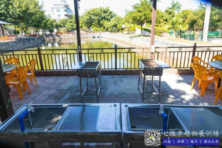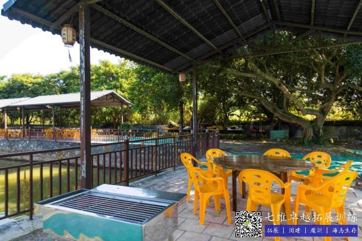 戶外(wài)燒烤場建設在魚塘(táng)邊(biān),環境秀麗,綠樹成(chéng)蔭,並有遮雨棚。