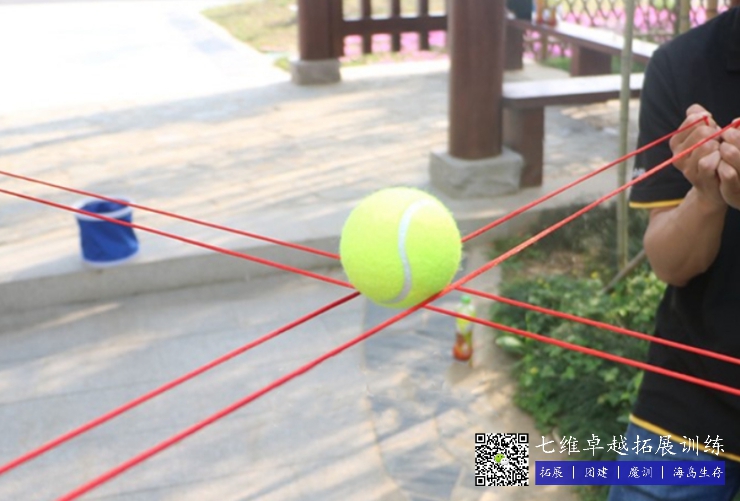項目任務:團隊成員手(shǒu)拉細線,形成三個(gè)平行軌道空間,通過配合協作使網球在軌道中安全的行走到(dào)終點,最後安全進(jìn)入桶中,網球(qiú)行進過程中不允許掉落。