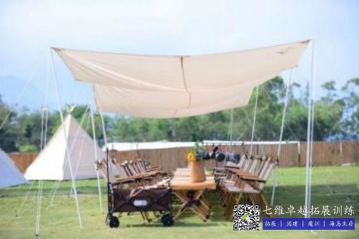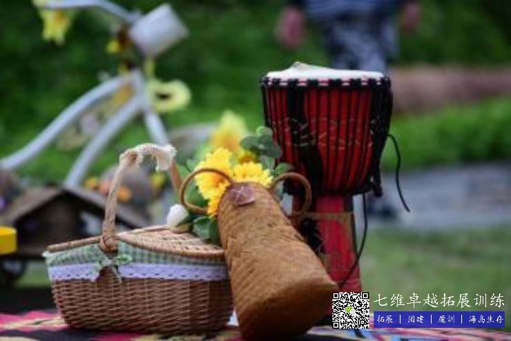 用田園風桌椅,天幕,彩旗,花植,地毯,娃娃等進行裝飾
