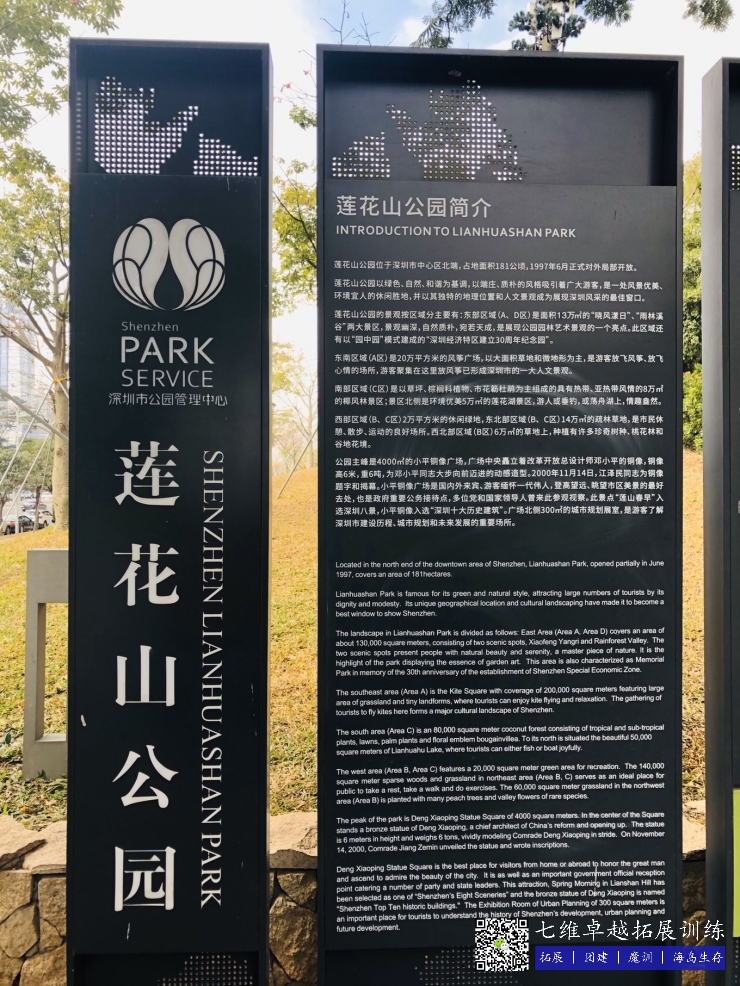 蓮花山公園籌建(jiàn)於1992年10月10日 ,1997年6月23日正(zhèng)式對外局部開(kāi)放。直屬深(shēn)圳市人民政(zhèng)府城市管理辦公室領導。公園現已開發建設並向(xiàng)遊人開放的麵積為60公頃。綠色、環保、自(zì)然、和諧是整個公園(yuán)的基調。坐落於公園主峰的山頂廣場,海(hǎi)拔106米(mǐ),麵積達4000平方米。鄧(dèng)小平(píng)總書記(軍委主席)銅像矗立在廣(guǎng)場中央,中心區美景盡收眼底。在山(shān)頂廣場已成為廣大市民和中外遊人緬懷(huái)一代偉人風采、飽覽中心(xīn)區景(jǐng)色的最好去處。