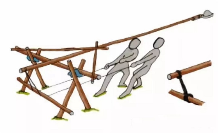 3、 拉動連接竹竿的長繩,炮架才能發射,竹竿通過杠杆原(yuán)理彈射出炮彈。