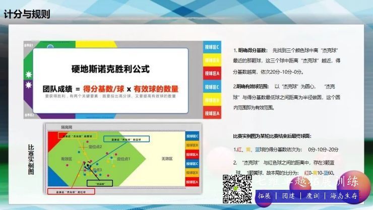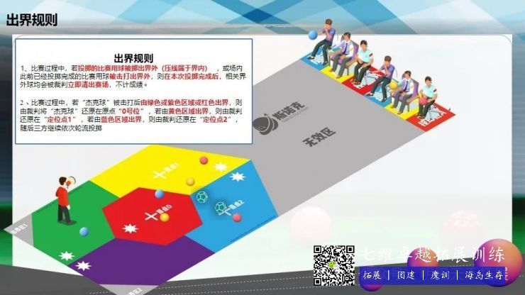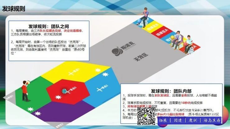 遊戲(xì)規則人員15到30人,按三種球(qiú)的顏(yán)色分為三個小組。首先輪流投擲目標球,目標球靠近(jìn)場地最中(zhōng)心的為有效(xiào)球。然後(hòu)三個小組按順(shùn)序投擲彩球,當各組彩球全部投完之後。找出距離目標球最(zuì)遠的一種顏色的球作為淘汰(tài)球,並以此(cǐ)為半(bàn)徑目標求為中(zhōng)心畫一個圓,距離目標球最近的顏色的球,每個球得10分。距離目標球相對(duì)較遠(yuǎn)的球,每個球得5分。根據(jù)時間進(jìn)行多局的比賽。最(zuì)終得分最(zuì)高的小組獲勝。這個項目的好玩之處就在於目標球是一直在變化之中,一直存(cún)在著不(bú)確定性(xìng)。投球手(shǒu)每次投球都有策略在裏麵,整個過程都是緊(jǐn)張刺激(jī),所以增加了(le)硬地斯諾克的娛樂性(xìng)和刺激性,以及挑戰性。